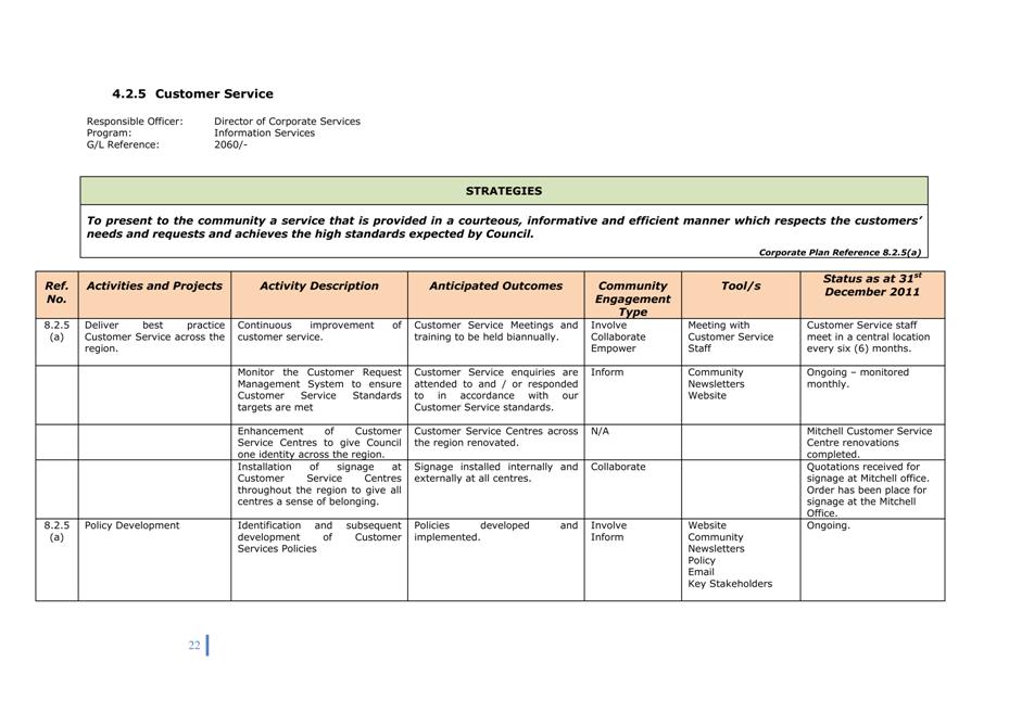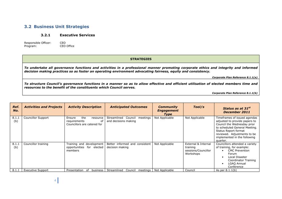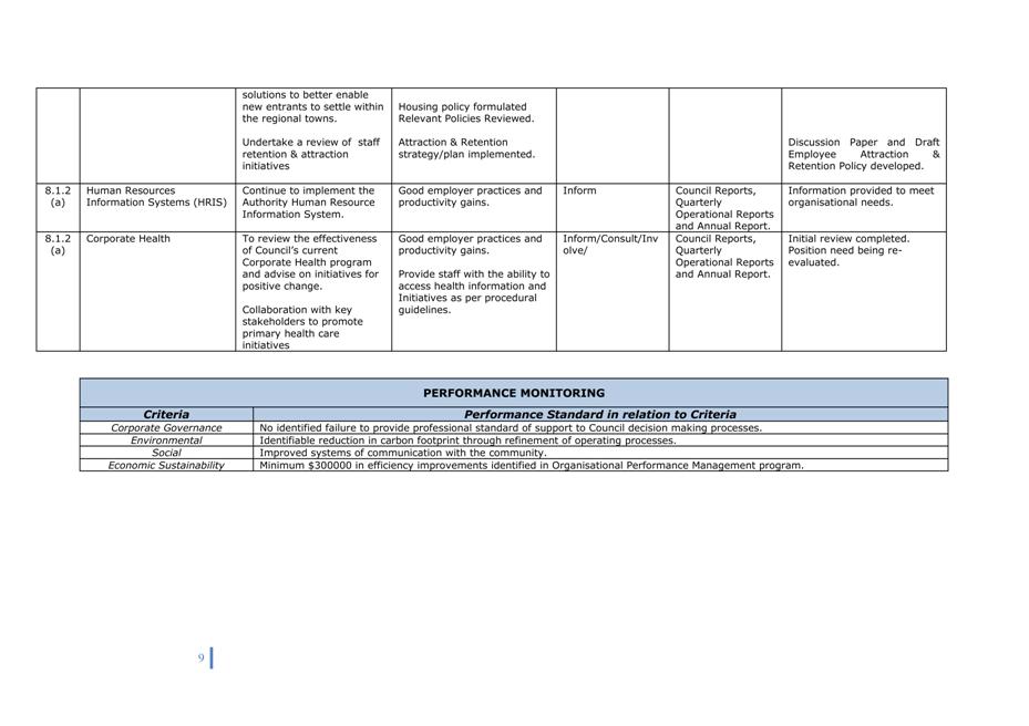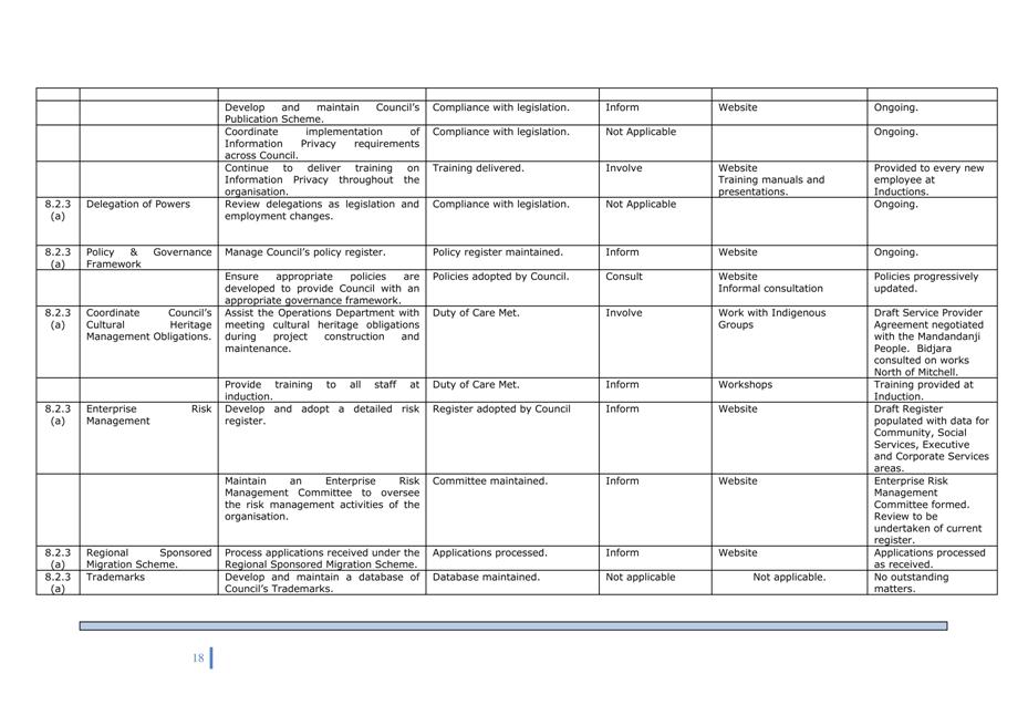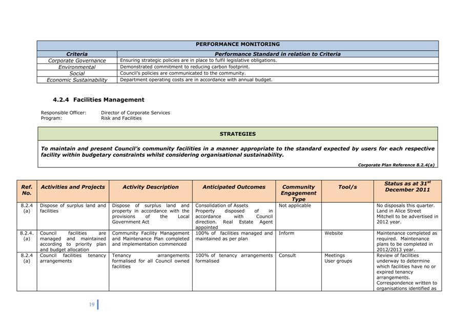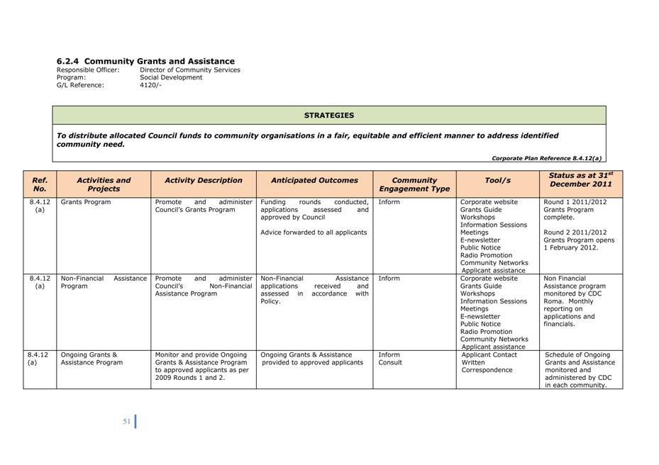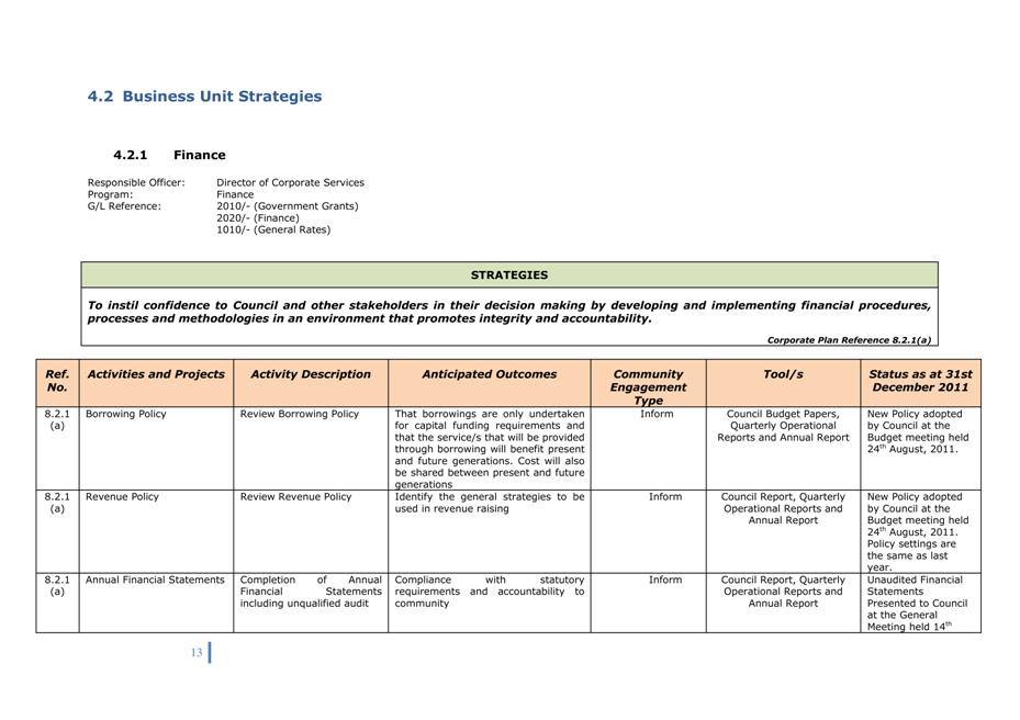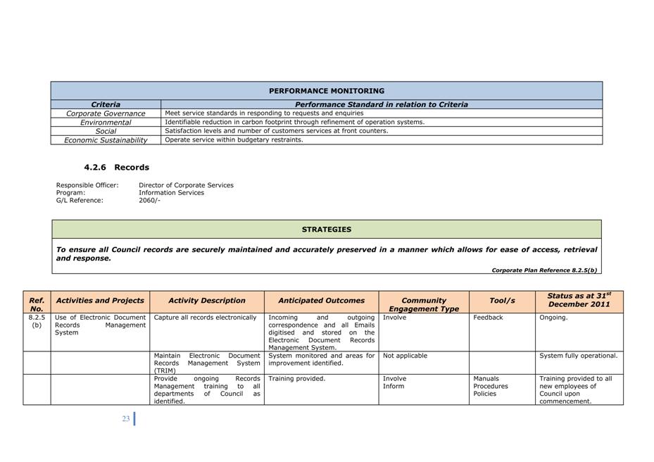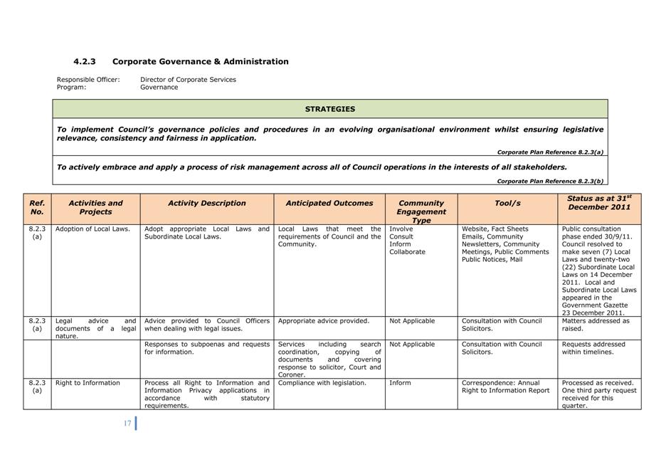 Corporate Plan 2009-2013 — 8.2.3(a) To implement Council’s governance policies and procedures in an evolving organisational environment whilst ensuring legislative relevance, consistency and fairness in application.