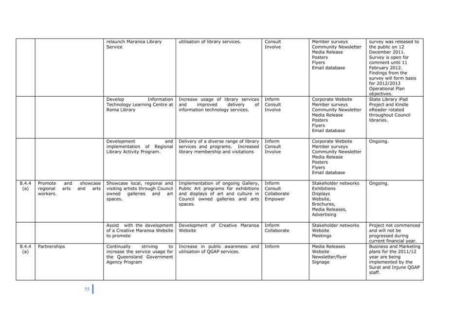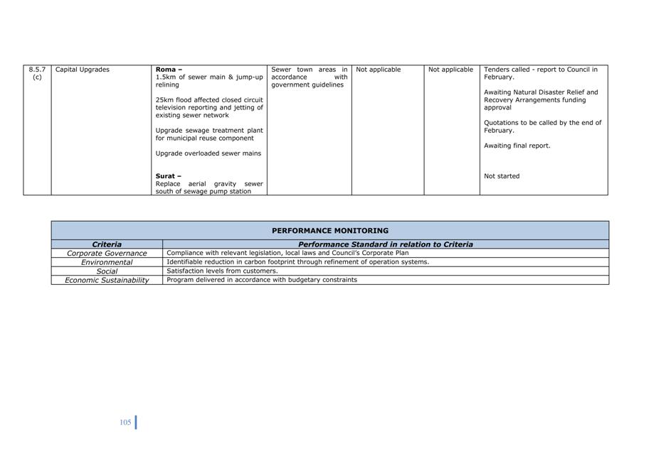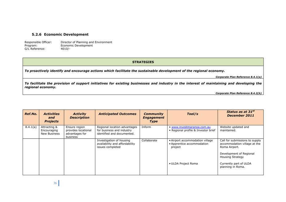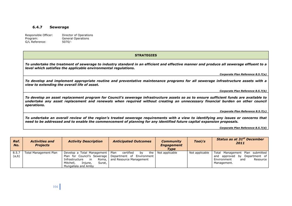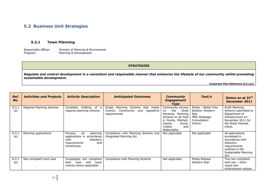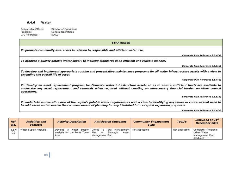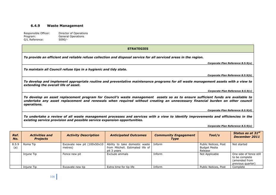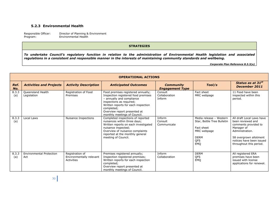 Quarterly reports on the implementation of Corporate and Operational Plans must be submitted to Council. The intention of the quarterly report is to describe the activities undertaken in the preceding period in support of the activities in the Operational Plan and to explain the extent to which the activities have advanced a strategy in the Corporate Plan.