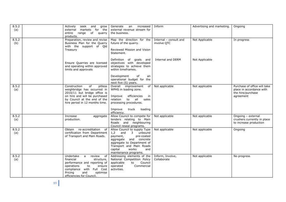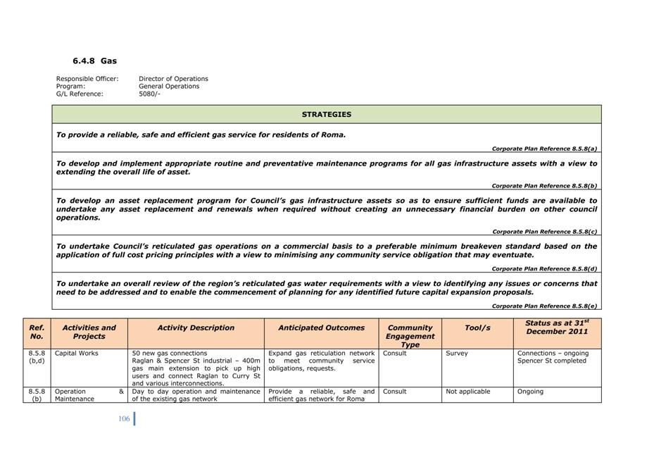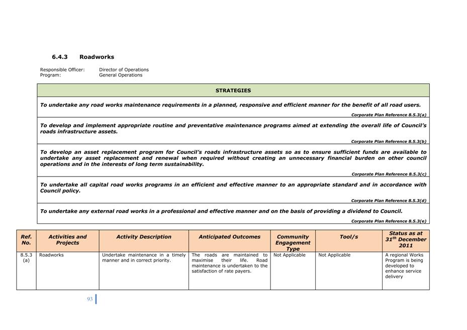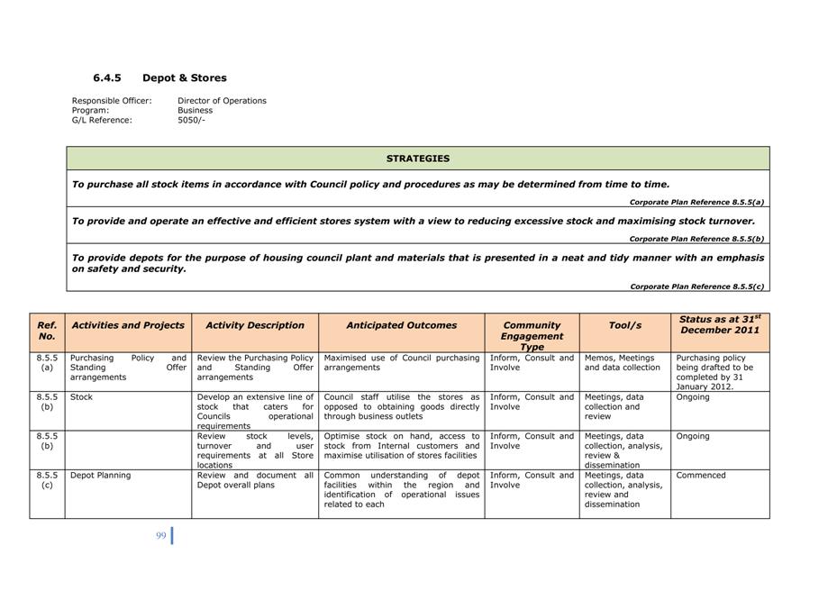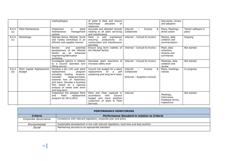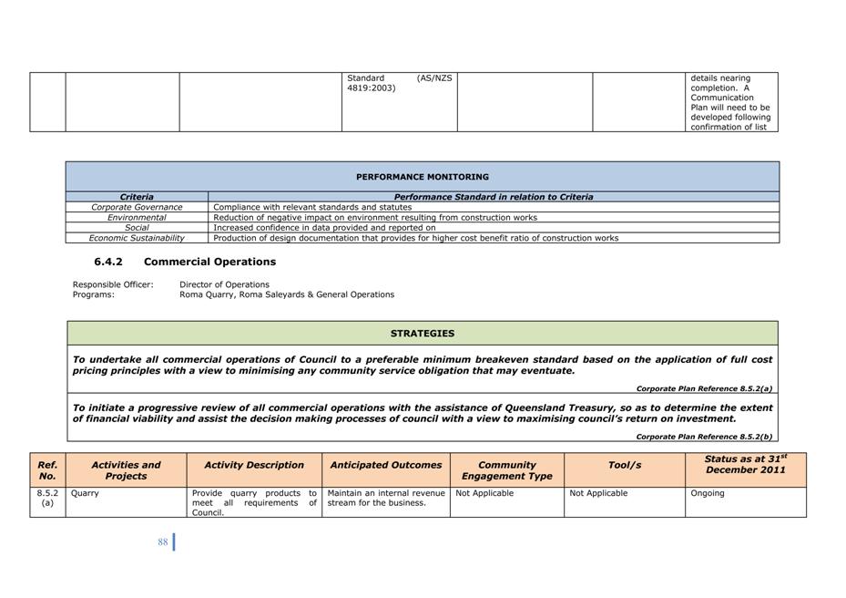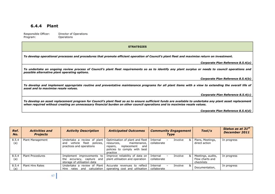 Corporate Plan 2009-2013 — 8.5.4(b) To undertake an ongoing review process of Council's plant fleet requirements so as to identify any plant surplus or needs to council operations and possible alternative plant operating options.