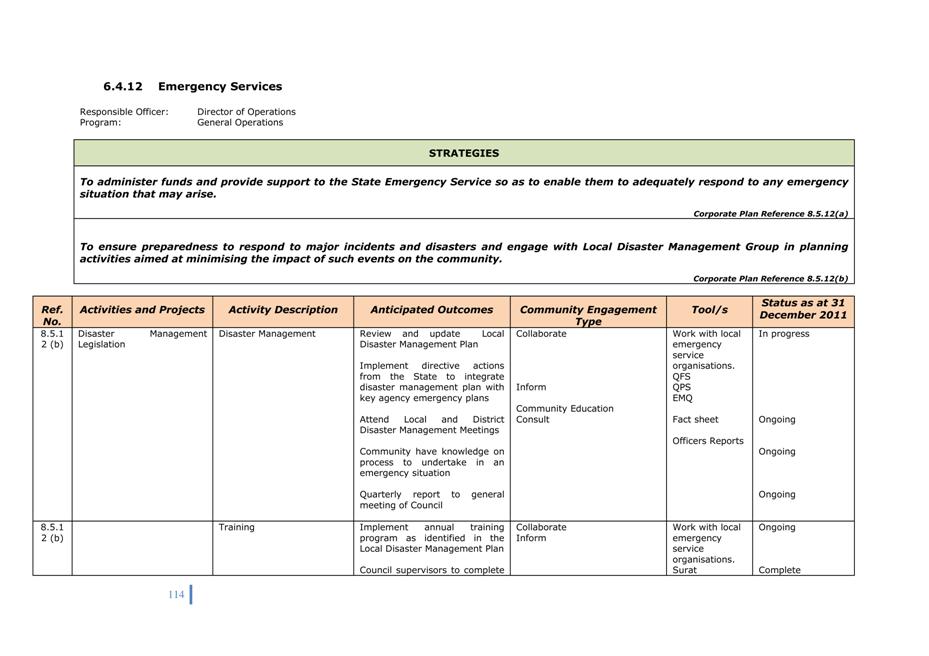 Corporate Plan 2009-2013 — 8.5.12(b) To ensure preparedness to respond to major incidents and disasters and engage with Local Disaster Management Group in planning activities aimed at minimising the impact of such events on the community.