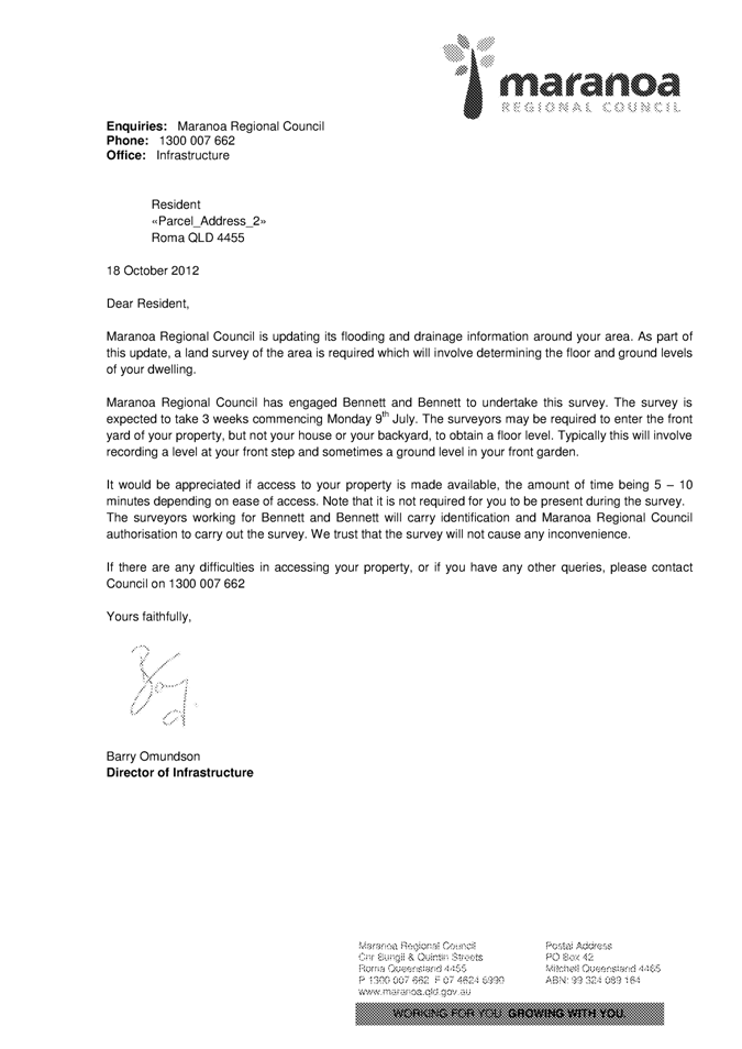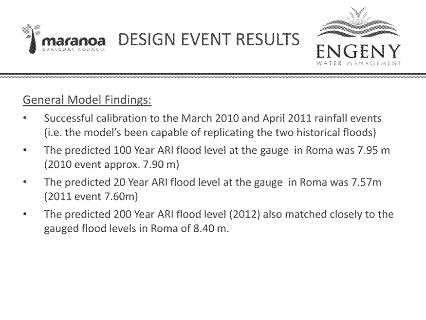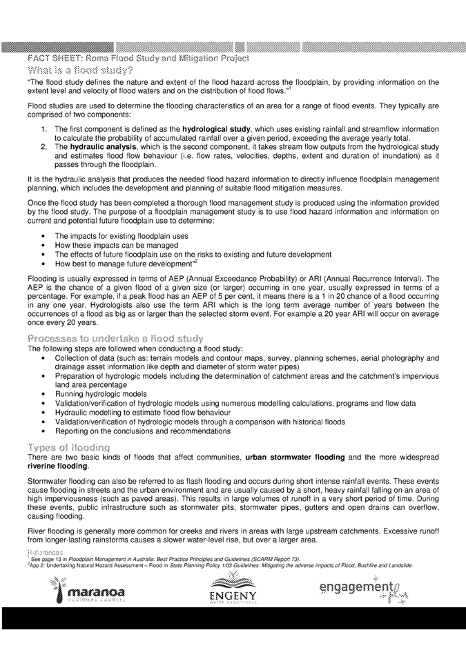 - Roma Flood Study and Mitigation Project, Flood Study Report (Stage 1), Engeny May 2012; and