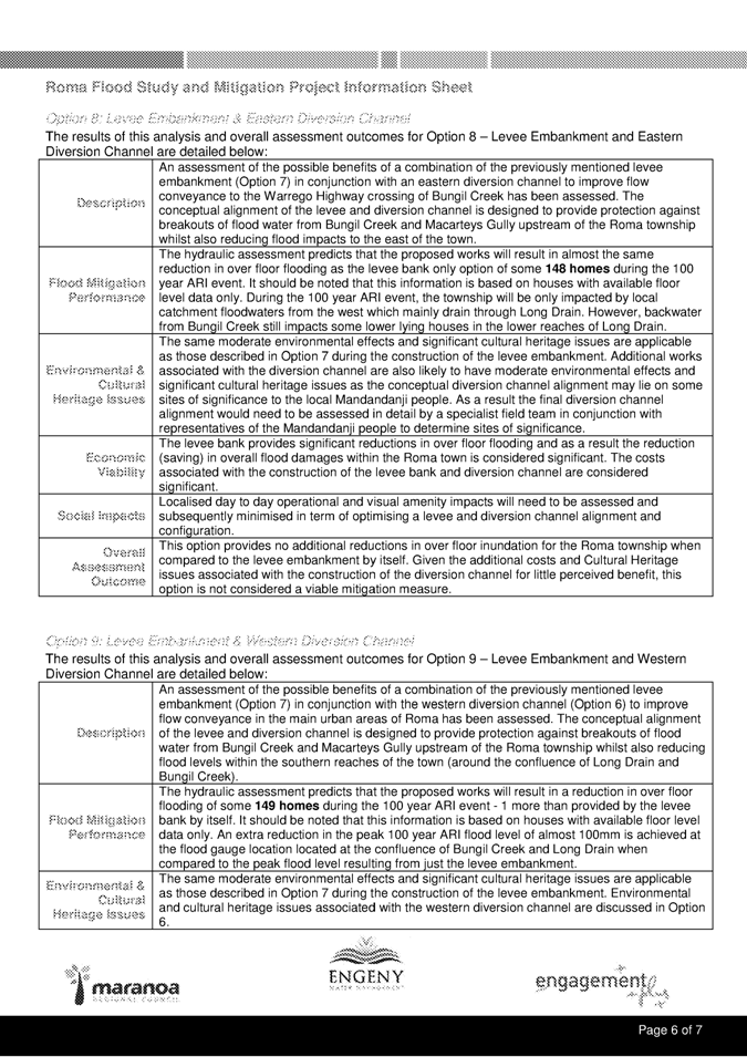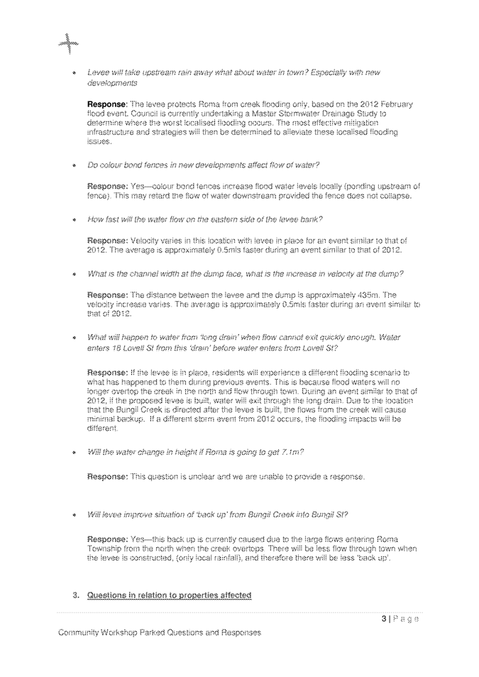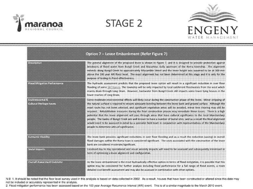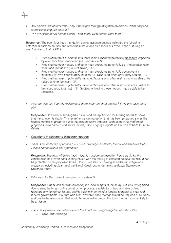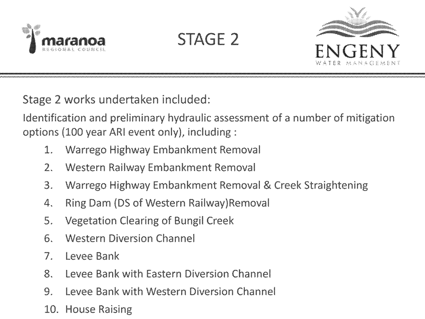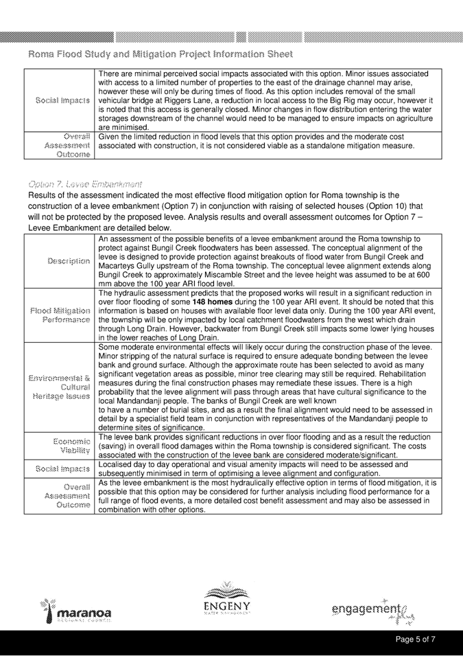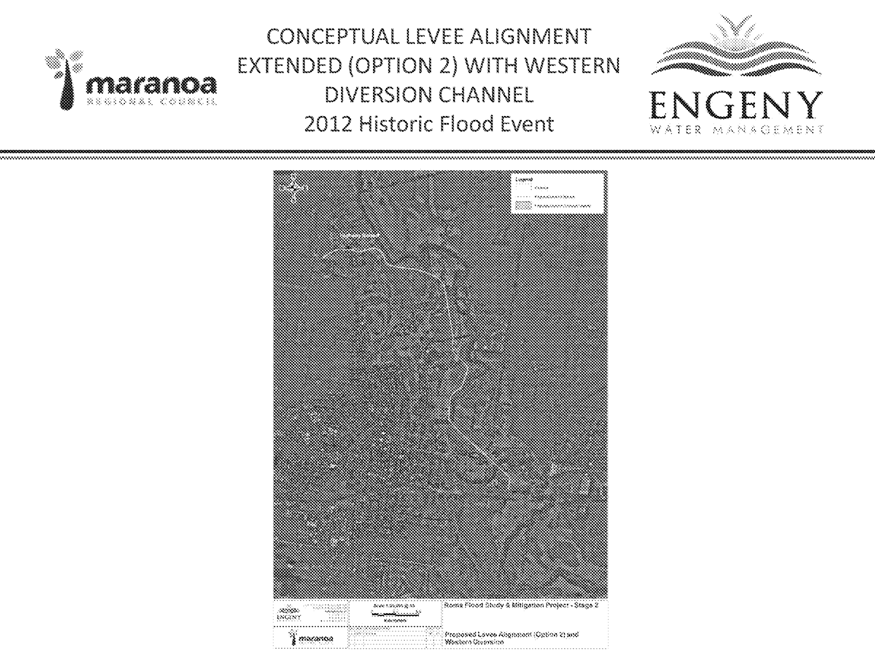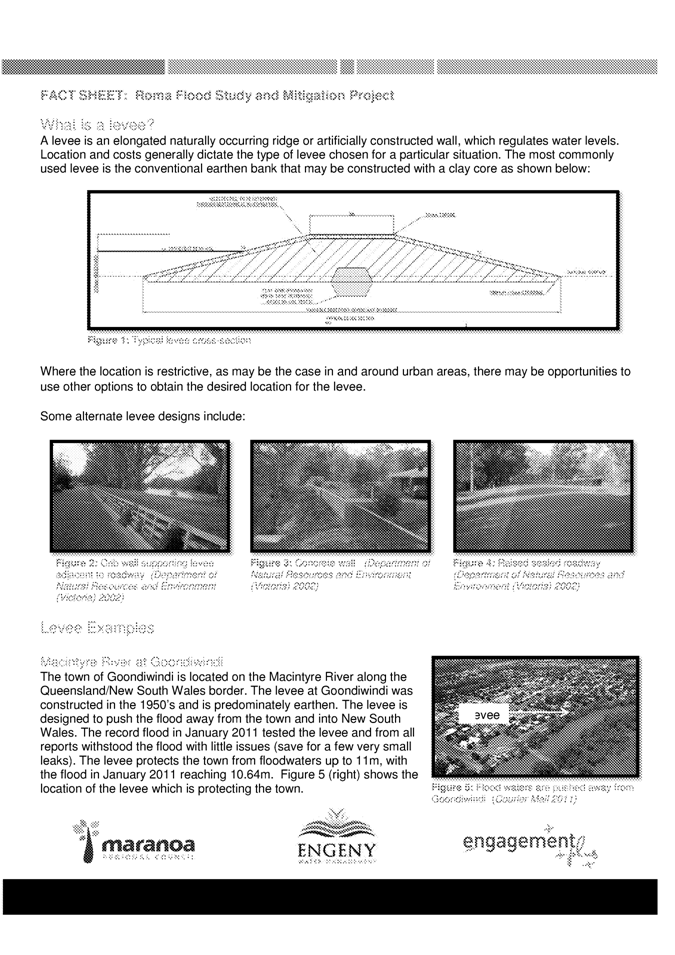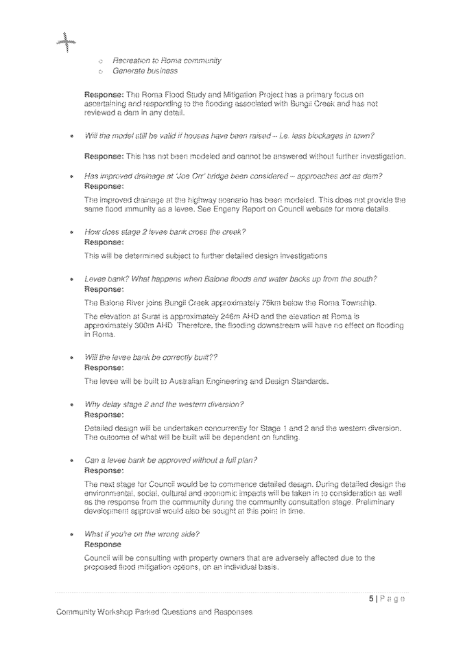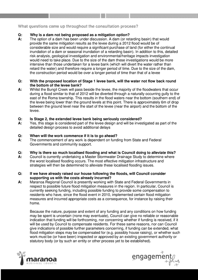 Executive Summary: A number of concerns were expressed during the recent community consultation in terms of the proposed mitigation measures recommended by Consultants Engeny. More specifically, a number of our community believes that the proposed levee would not work and is not needed if a dam were to be constructed upstream of Roma.