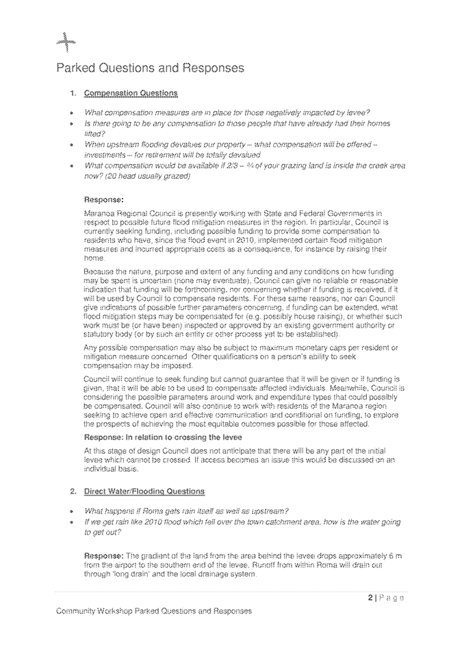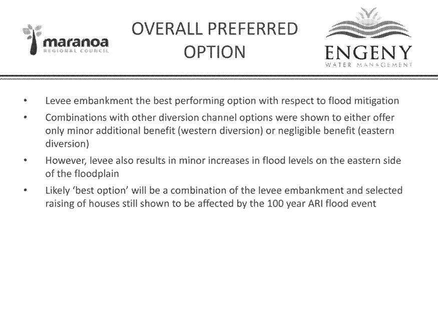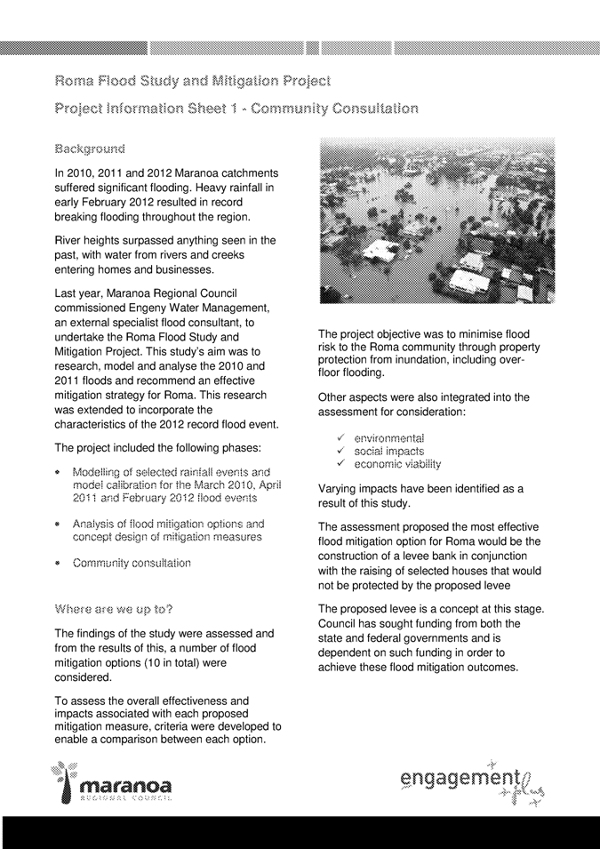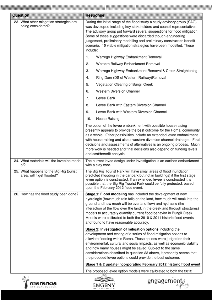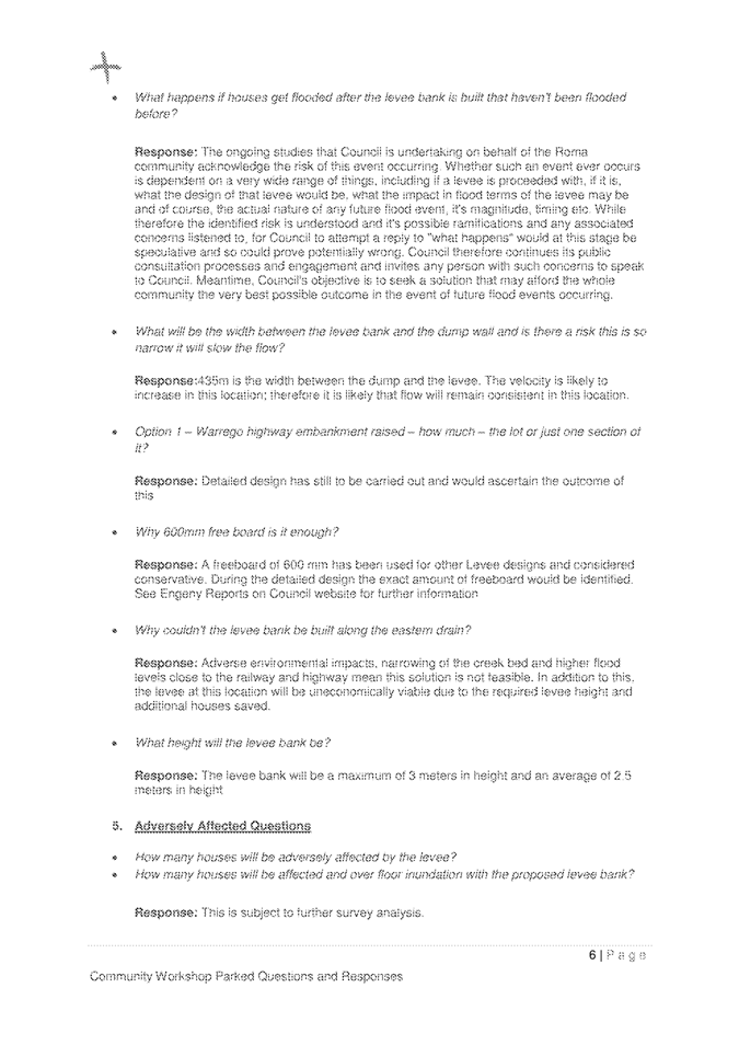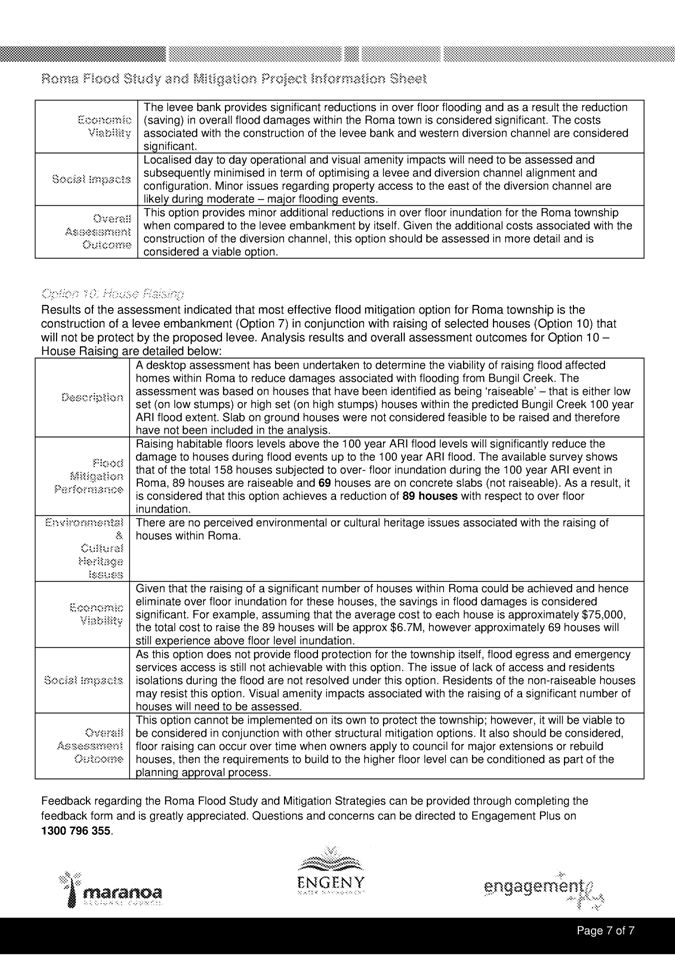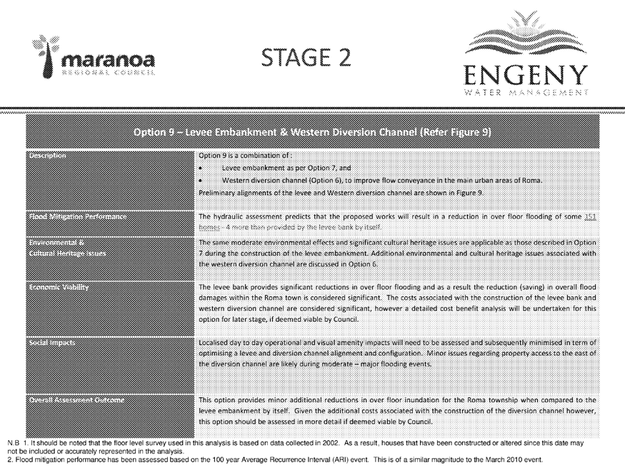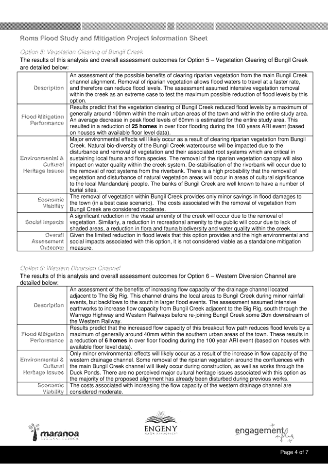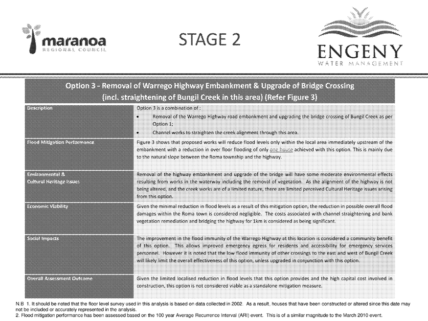 Executive Summary: A number of concerns were expressed during the recent community consultation in terms of the proposed mitigation measures recommended by Consultants Engeny. More specifically, a number of our community believes that the proposed levee would not work and is not needed if a dam were to be constructed upstream of Roma.
