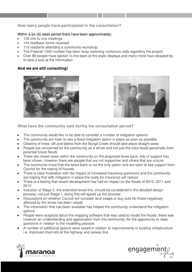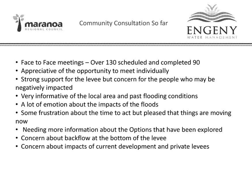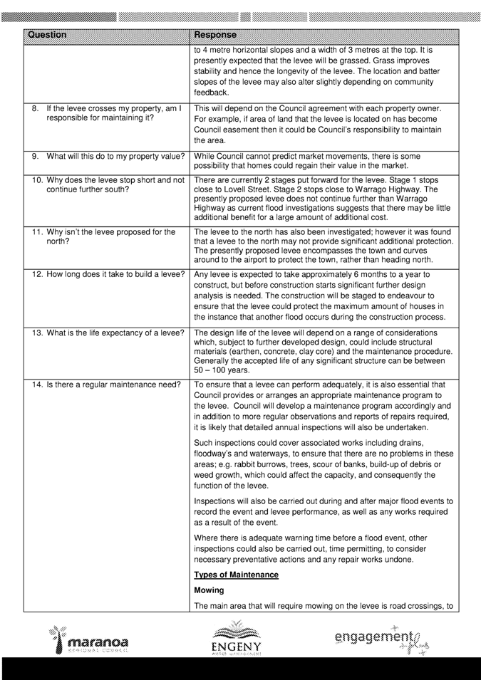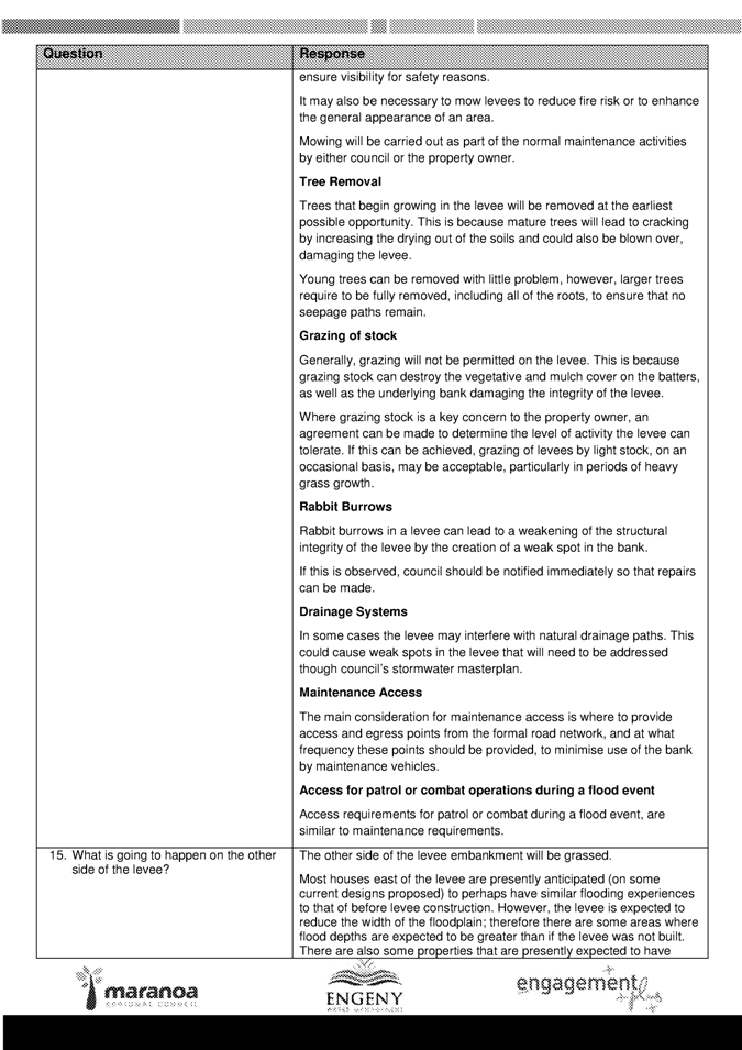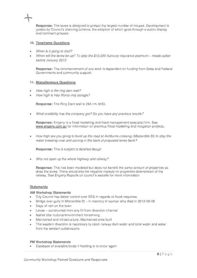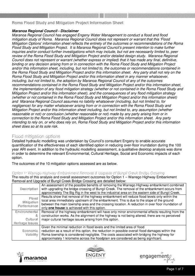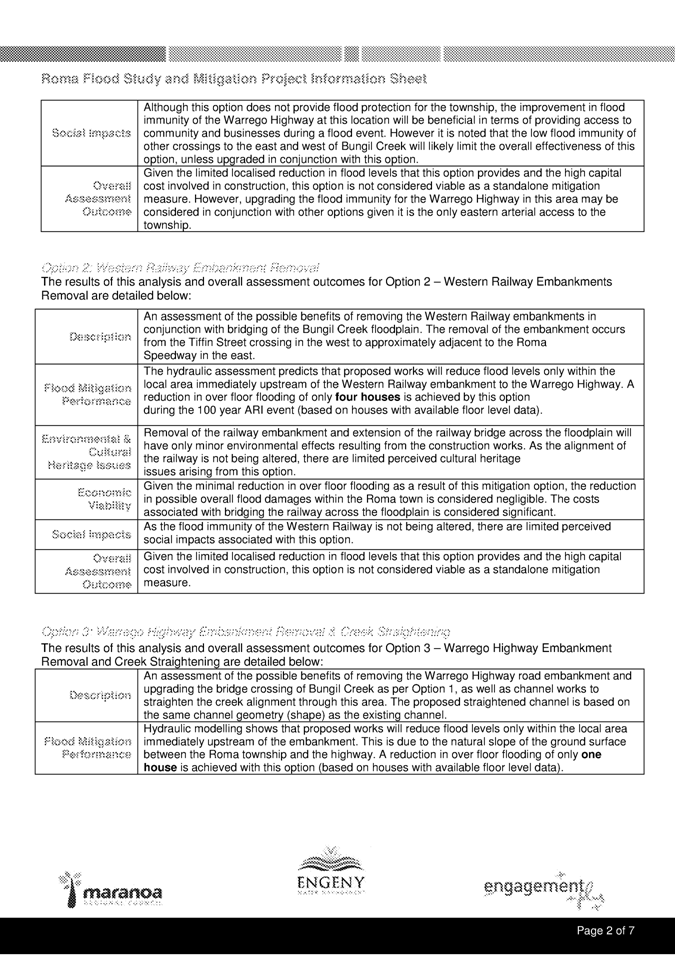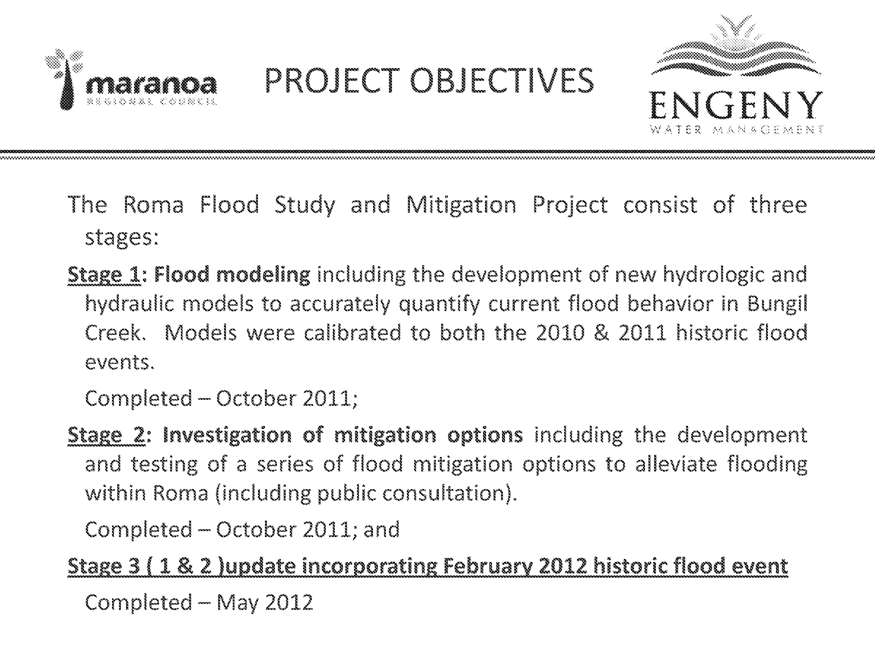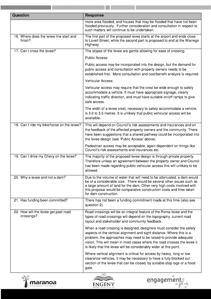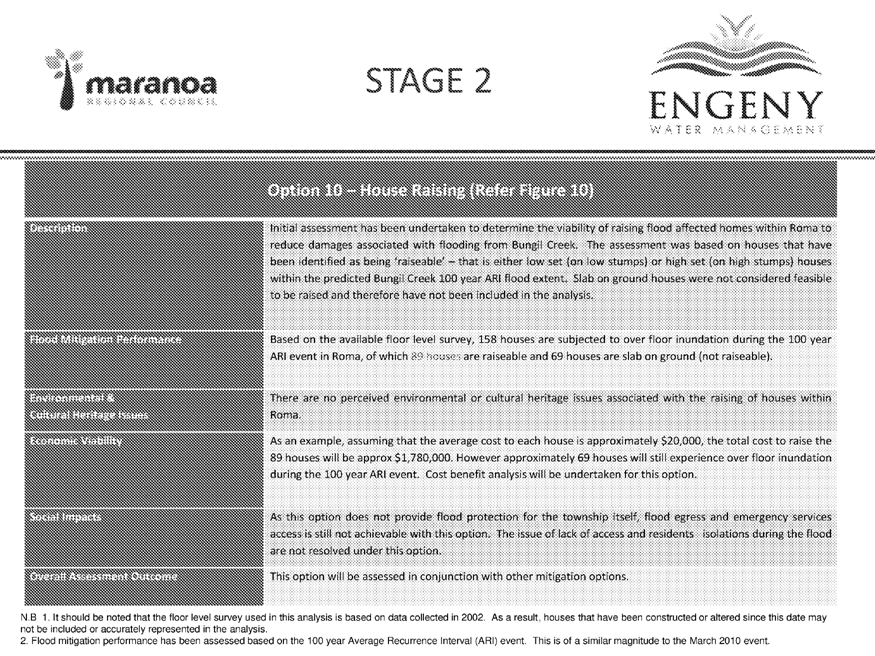Executive Summary: A number of concerns were expressed during the recent community consultation in terms of the proposed mitigation measures recommended by Consultants Engeny. More specifically, a number of our community believes that the proposed levee would not work and is not needed if a dam were to be constructed upstream of Roma.