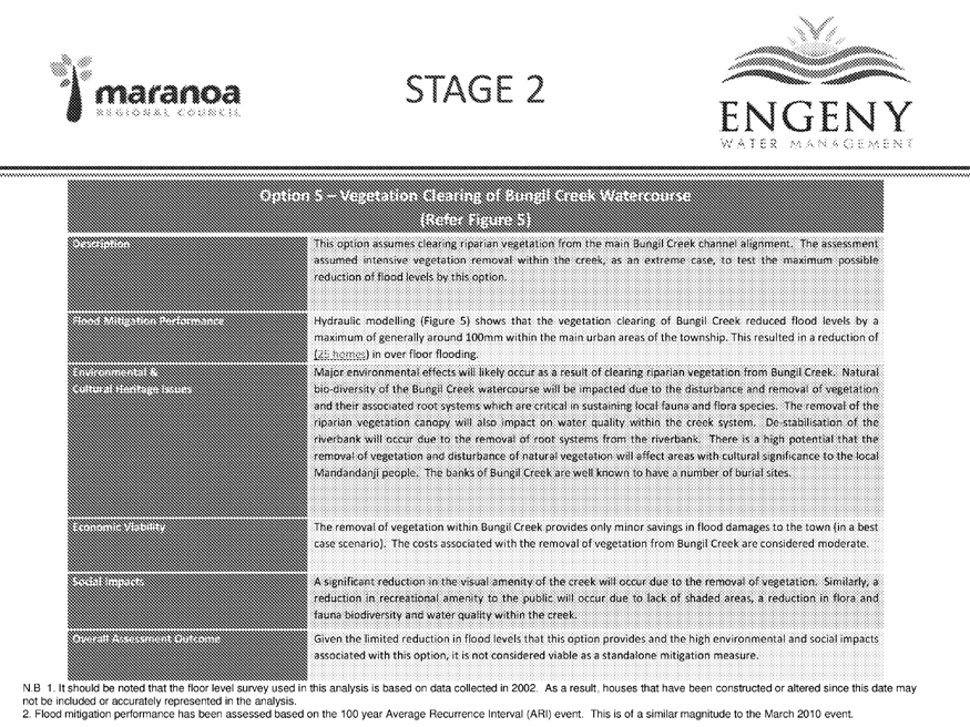 - Option 2 Mooga Mooga Creek dam site = modelling not undertaken at the time of writing however GHD have advised that the combination of the Bungil dam site into a combined Bungil – Mooga Mooga dam would not provide any greater attenuation than the Pony Club option;