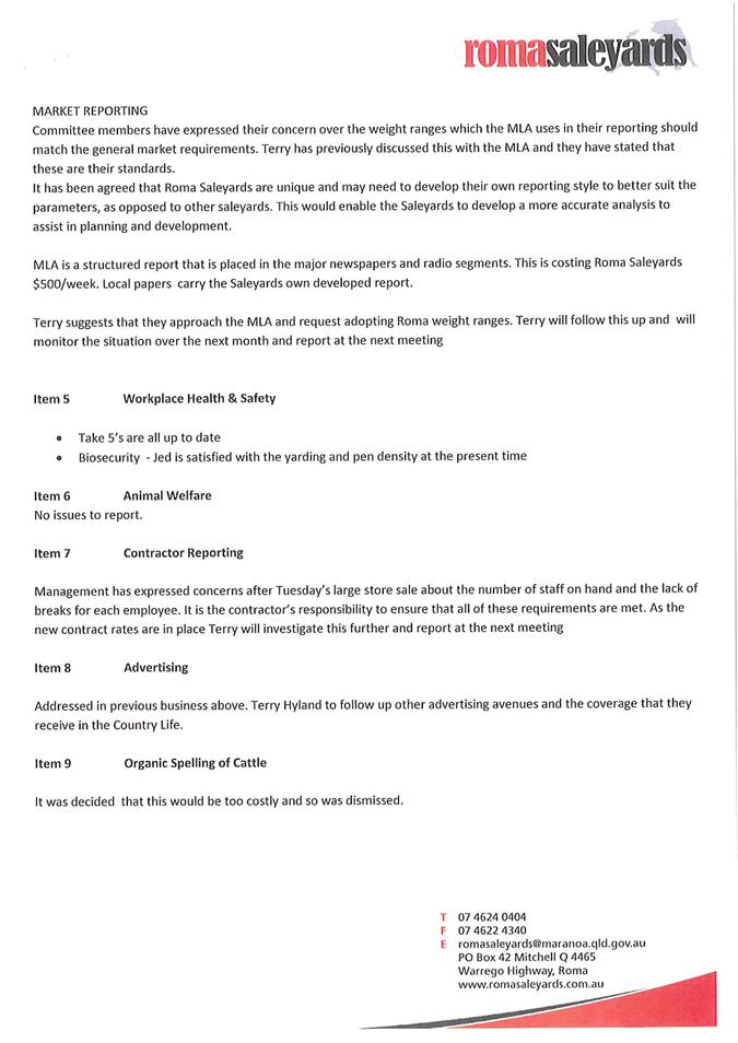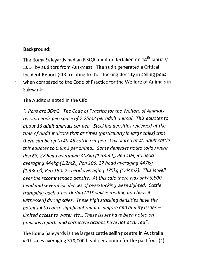 The Roma Saleyards had a National Saleyards Quality Assurance (NSQA) audit undertaken on 14 January 2014, relating to the stocking density in selling pens when compared to the Code of Practice for the Welfare of Animals in Saleyards.